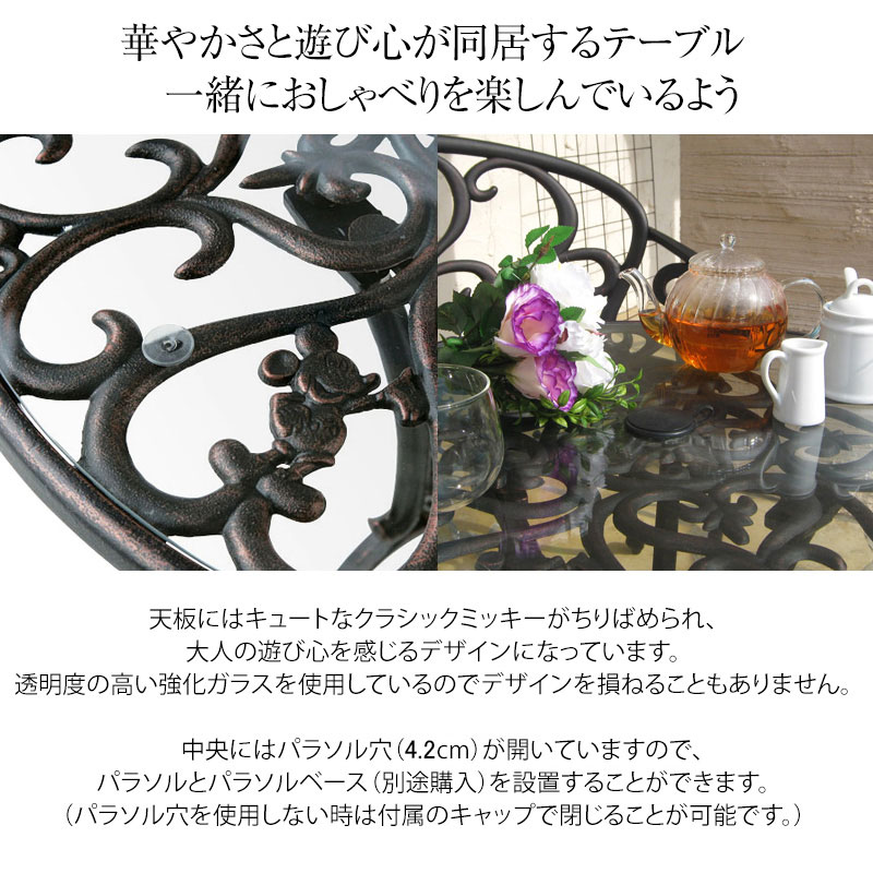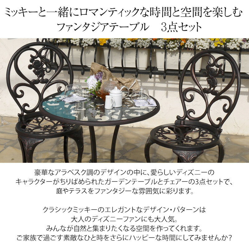 ブロンズ調のアンティークミッキーが大人可愛い ディズニー ファンタジア シリーズ ファンタジアテーブル 3点セット ディズニーファンタジアシリーズ アンティークミッキー 組立品 屋外OK こちらはテーブル3点セットの販売ページです ミッキーと一緒にロマンティックな時間と空間を楽しむ ファンタジアテーブル 3点セット 豪華なアラベスク調のデザインの中に、愛らしいディズニーのキャラクターがちりばめられたガーデンテーブルとチェアーの3点セットで、庭やテラスをファンタジーな雰囲気に彩ります。